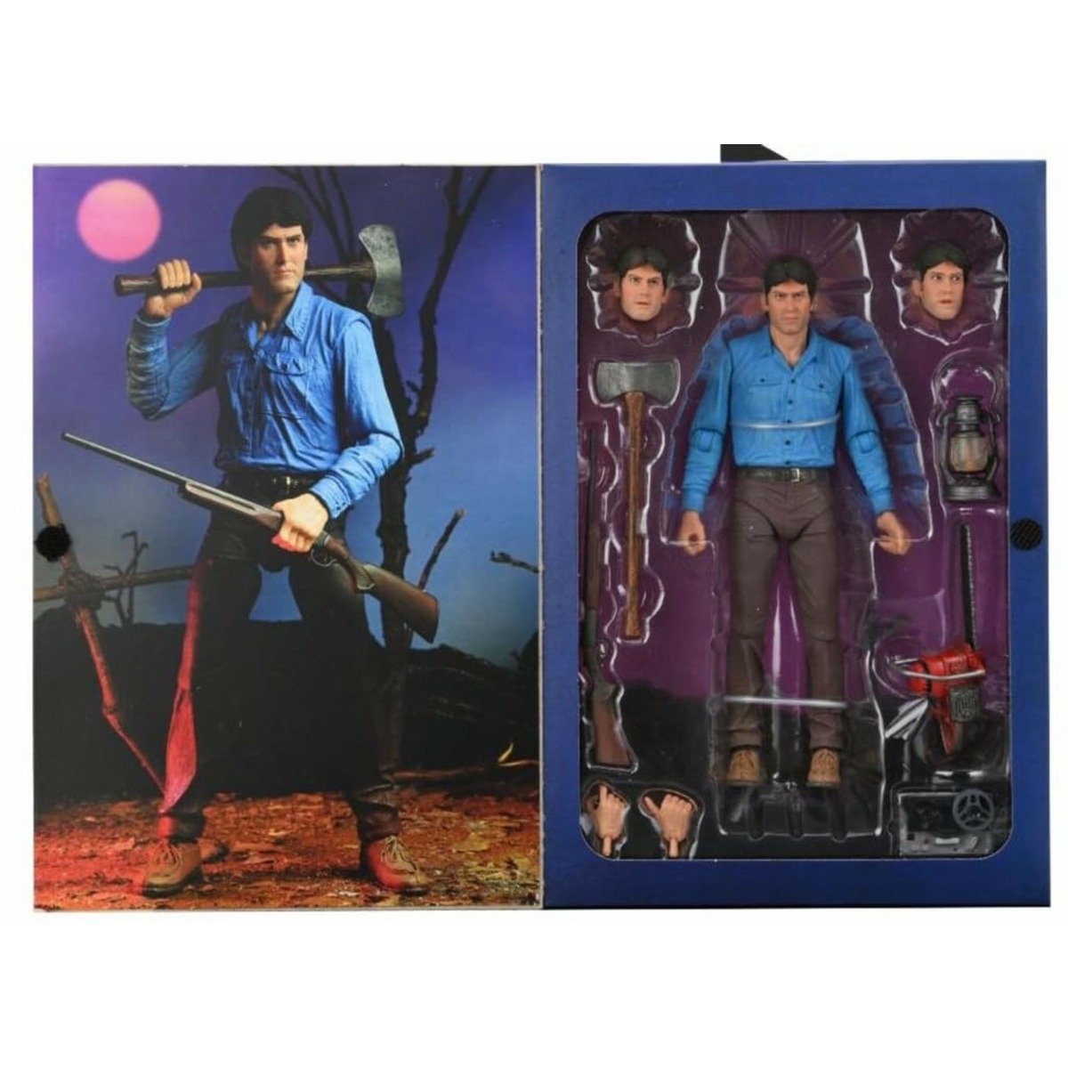 Celebrating the 40th anniversary of the iconic cult classic movie The Evil Dead, NECA is excited to release a special Ultimate Ash 7” scale action figure! Ash features the likeness of the one and only Bruce Campbell, and comes with three interchangeable heads, chainsaw, axe, shotgun, lantern, tape player, and more!